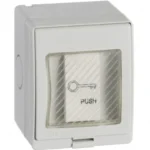 SPB020S – Surface blue rim plastic exit button with disabled logo